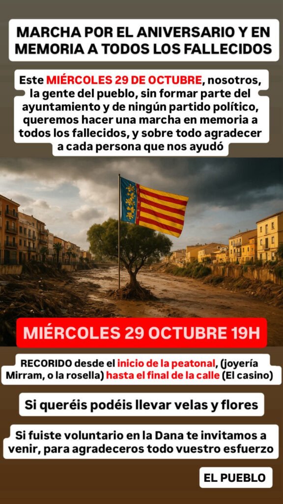 PAIPORTA. — Este miércoles 29 de octubre a las 19:00 horas, los vecinos de Paiporta han convocado una marcha ciudadana en memoria de las víctimas, un acto independiente y sin vínculos con el Ayuntamiento ni con ningún partido político.